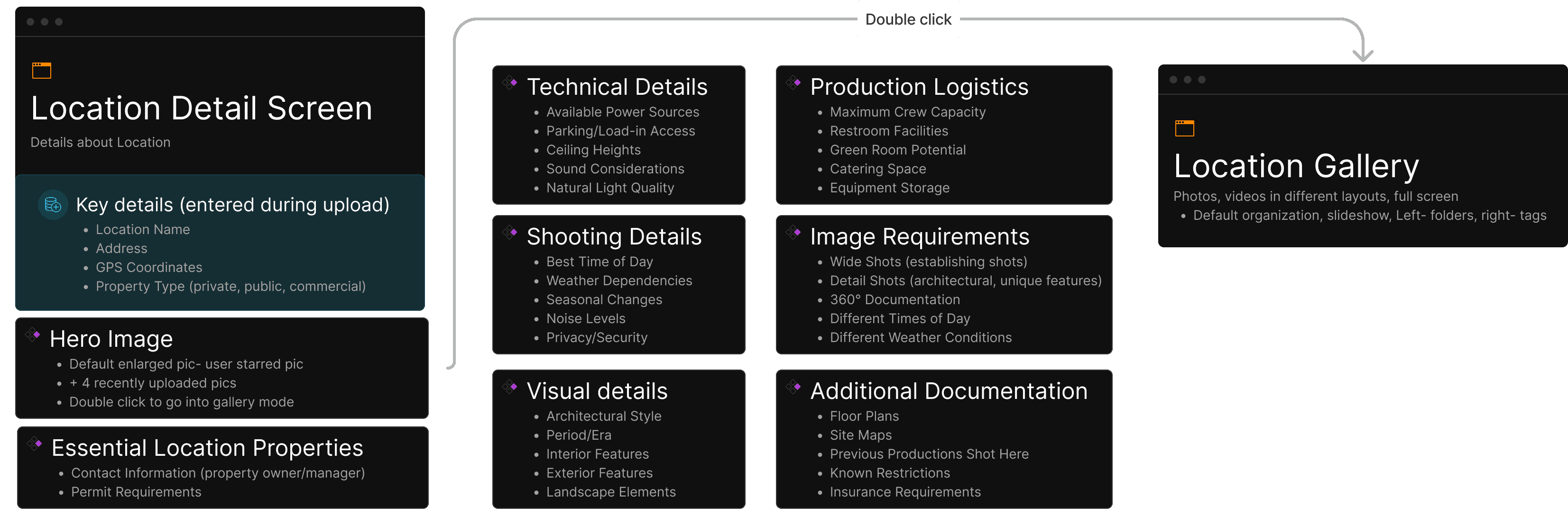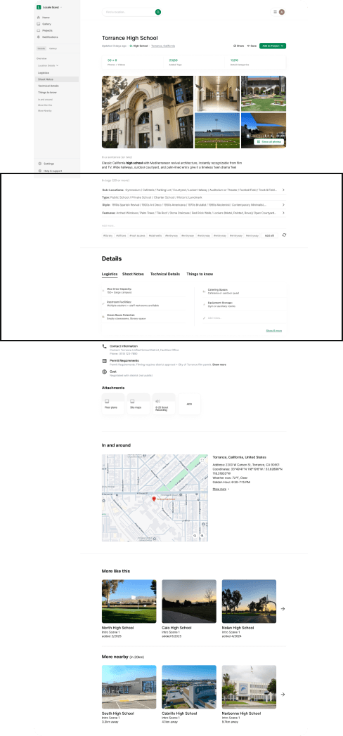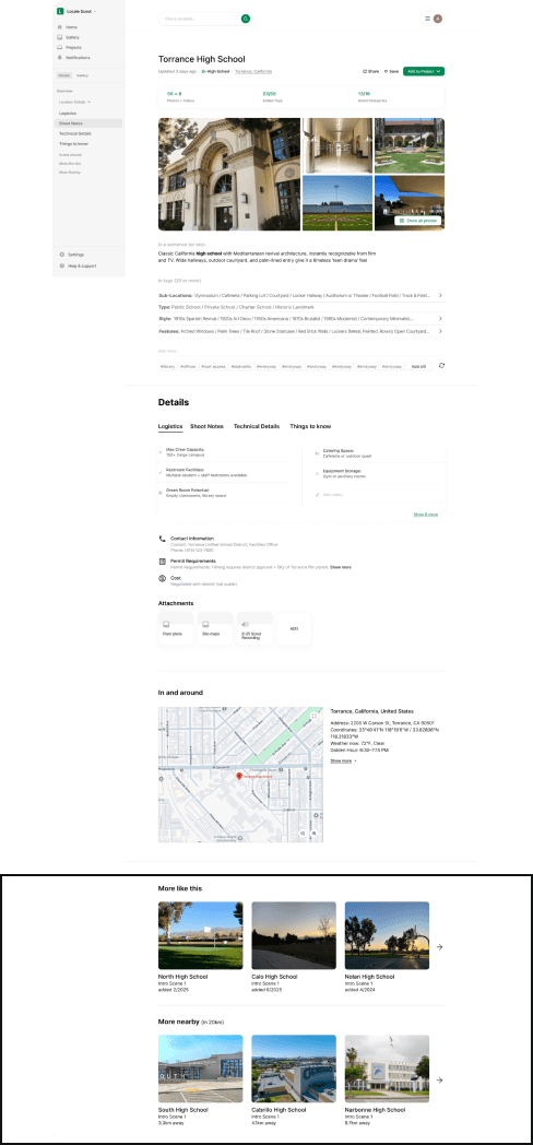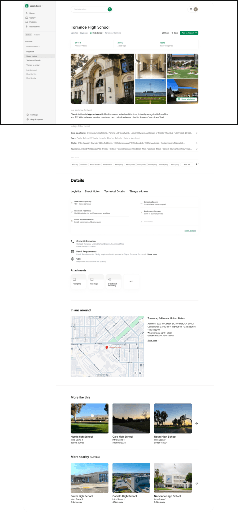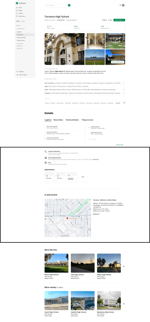 Focusing on the Location Detail and Gallery flows, we shaped how locations become production-ready assets. This work helped define requirements and clarify the product’s key features, user interactions, and content structure, connecting creative and logistical needs in one place.