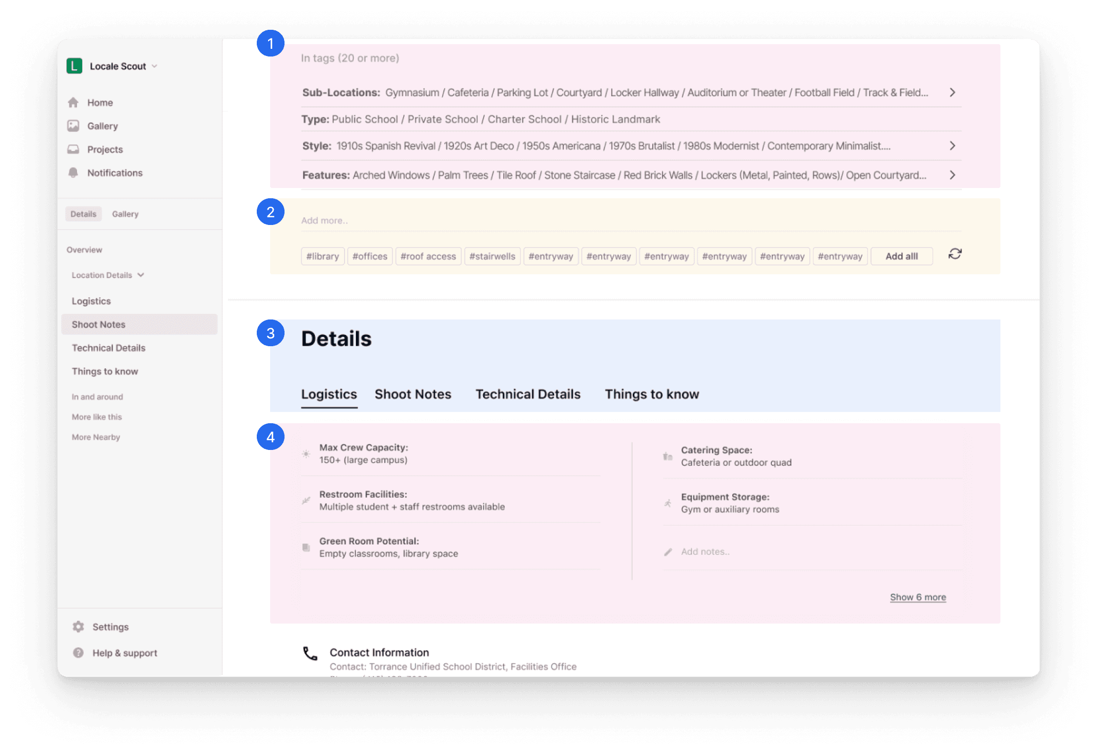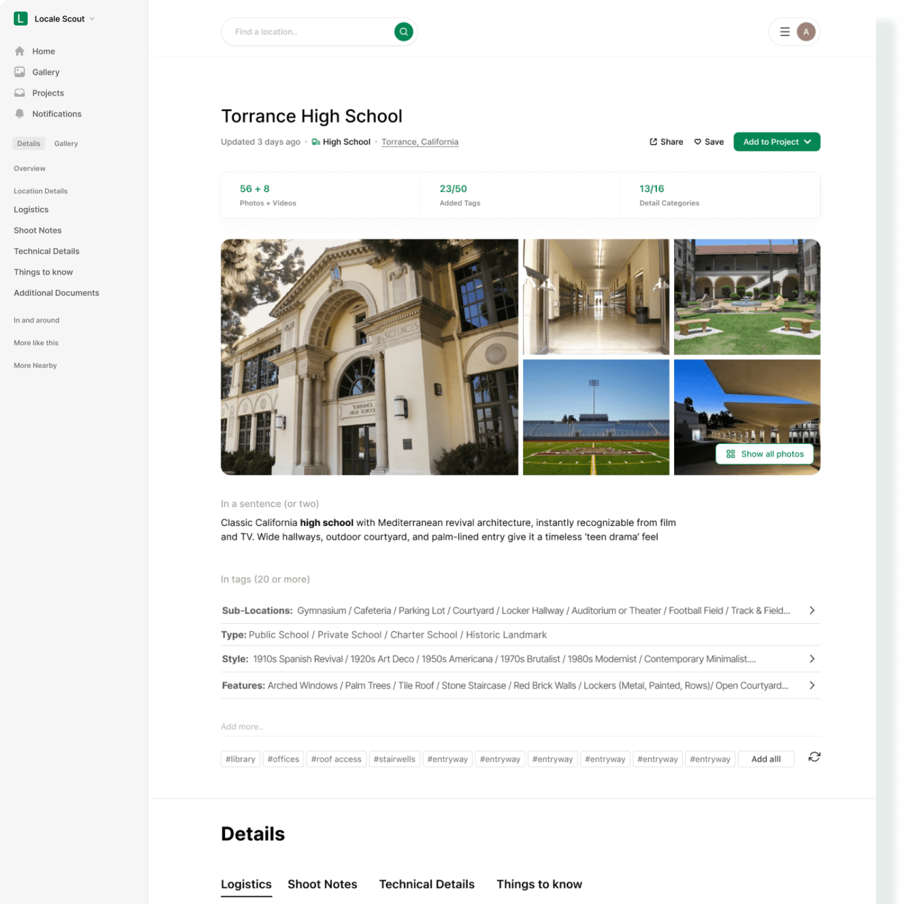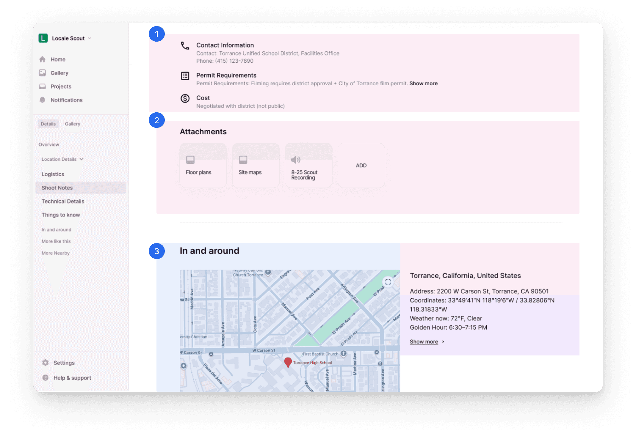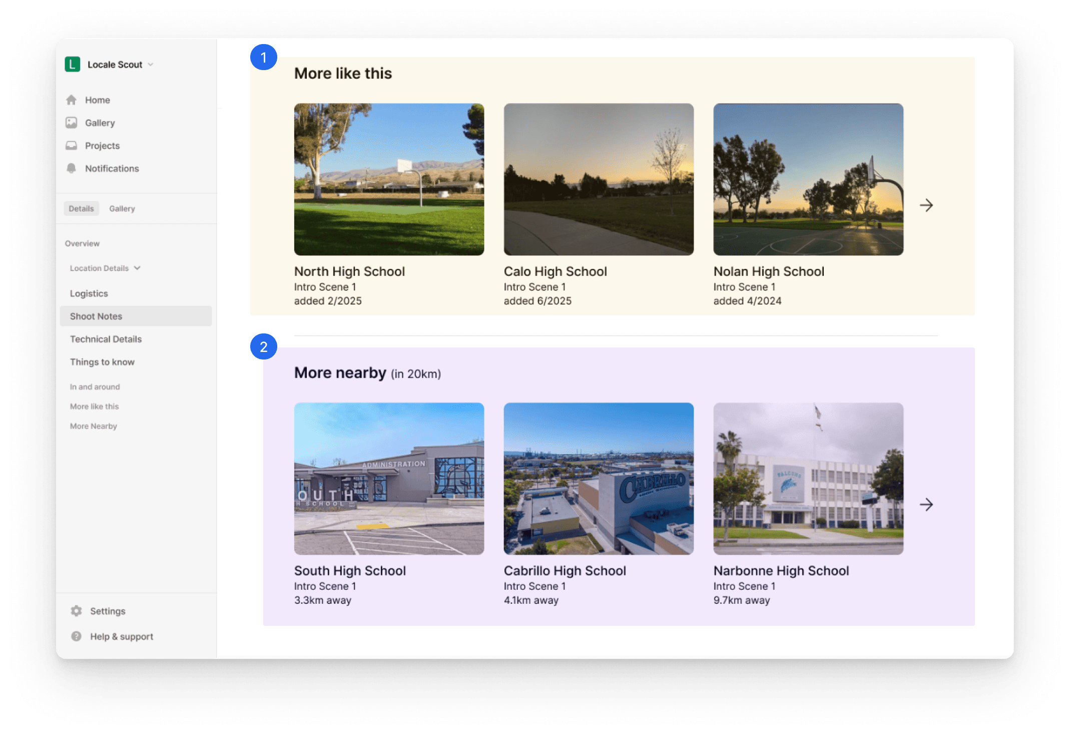 List of nearby scouted or public locations (within a user-set radius). API-fed results that leverage geo data to show what’s accessible for the same shoot day that encourages building clustered production days (ex: 2 Fremont locations within 20 km).