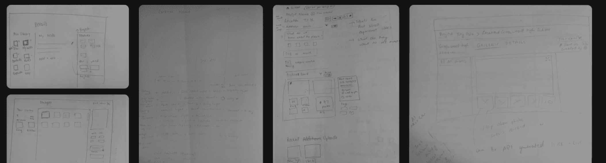 The location detail page had to be designed to make that first step easy, to overcome that “blank page” hesitation, giving users a place to start easily, build naturally, and see progress right away. These sketches helped test navigation hierarchy, tagging models, and the relationship between the detail page and gallery before committing to layout decisions and helped me quickly visualize how it all came together.