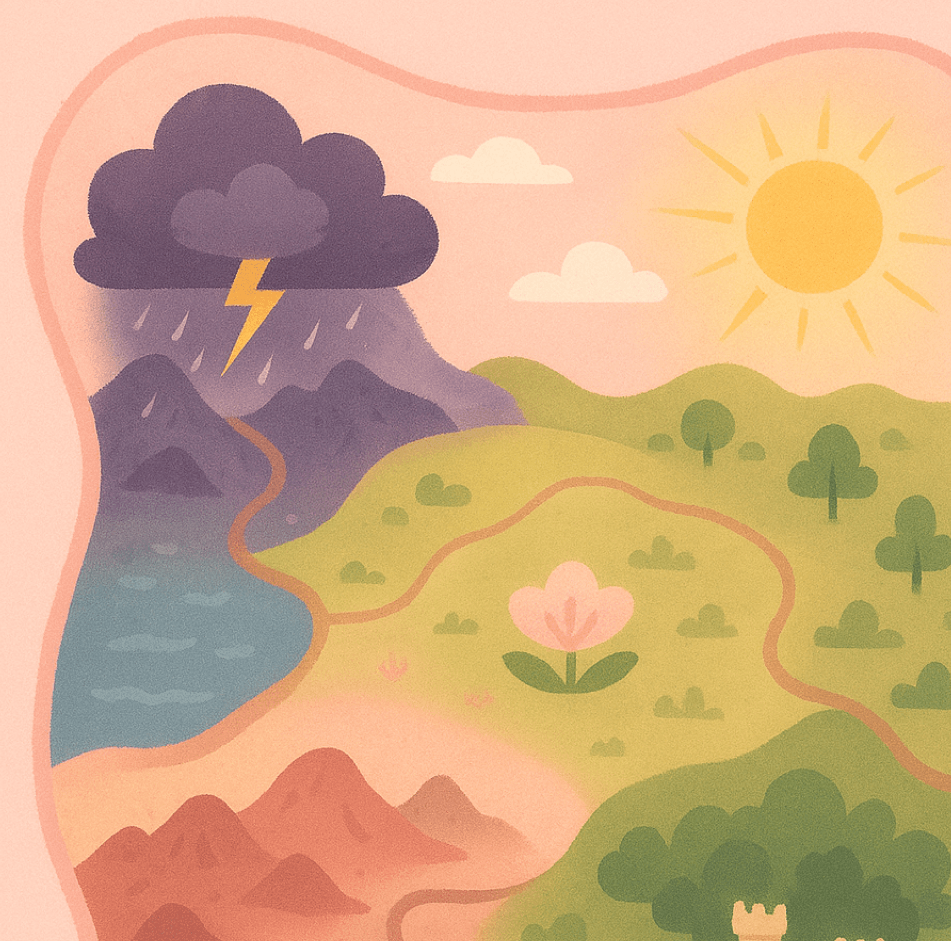 Choosing the day’s “weather” sets the tone (storms, fog, sunshine, or bloom) depending on how the player feels in real life. Selecting any discomfort, like cramps or fatigue, influences different regions of the map. The tracking is woven into gameplay, not shown as data.